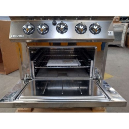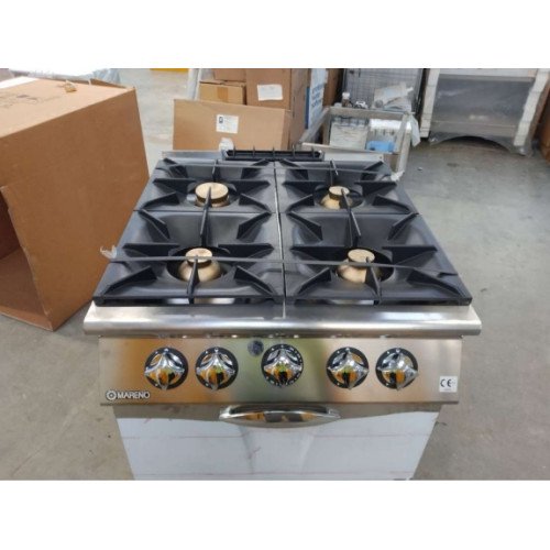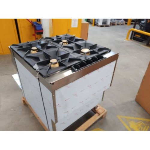 8 kWRange cooker with gas hob constructed from AISI 304 stainless steel. 20/10 pressed top, designed for flush alignment and to accommodate the water column accessory. Appliance comprises 4 sealed burners with maximum output of 10 kW. Safety tap with thermocouple for continuous output control from 2.5 to 10 kW. Main burner ignition by means of permanent, low−energy pilot burner (170 W). Pilot burner and thermocouple are located underneath the main burner body, protected from accidental impact and any spills. Hob features radiused corners for ease of cleaning and pan supports in RAAF enamelled cast−iron (acid, alkali and flame resistant). GN 2/1 gas oven with thermostatic control valve providing temperature adjustment from 50°C to 300°C. Burner with stabilized flame complete with pilot flame, safety thermocouple and piezoelectric ignition. Cooking chamber in stainless steel, dimensions 575x700x300h mm. Oven power 8 kW. Oven bottom in cast iron. Oven inner door in stainless steel with labyrinth seal. Appliance equipped with height